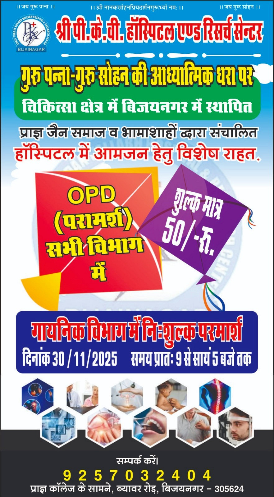 श्री पी के वी हास्पिटल एण्ड रिसर्च सेंटर, विजयनगर में 31 दिसम्बर 2025 तक निम्न सभी विभागों में सिर्फ ₹50 चिकित्सा परामर्श शुल्क (OPD)।
